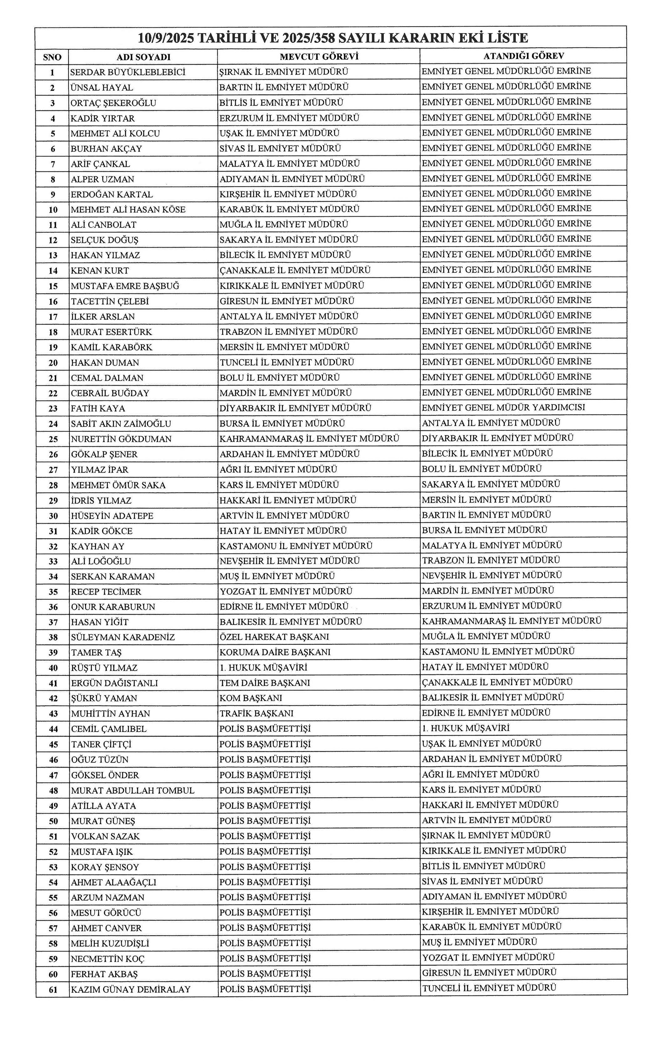Resmi Gazete'de yayımlanan karara göre, 37 ilin emniyet müdürü değişti, 22 ilin ise emniyet müdürü merkeze çekildi. İşte il il, isim isim o atamalar;