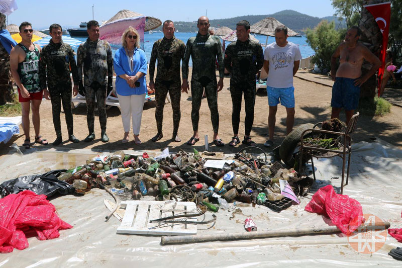Yaklaşık bir saat süren deniz dibi temizliği çalışmasında, cam ve metal şişeler ile plastik, metal atıklar, balıkçı ağları ve araç lastiklerinden oluşan 200 kilograma yakın atık kıyıya çıkarıldı. Farkındalık yaratması için kıyıda bir süre sergilenen atık malzemeler, ekipler tarafından ayrıştırılarak Bodrum Belediyesi 1. Sınıf Atık Getirme Merkezi’ne götürüldü.