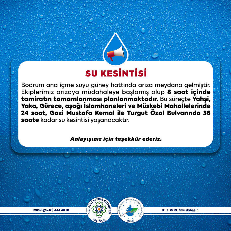 Muğla Su ve Kanalizasyon İdaresi (MUSKİ) Bodrum ana içme suyu güney hattında arıza meydana geldiğini duyurdu. Bu arıza nedeniyle Bodrum ana içme suyu güney hattından su alan bölgelere su veilemeyeceği açıklandı. MUSKİ açıklamasına göre arızayla ilgili çalışma başlatıldı. Bazı mahallelerde 24 saat, bazı mahalelerde de 36 saat (uzayabilir / kısalabilir) su akmayacak.