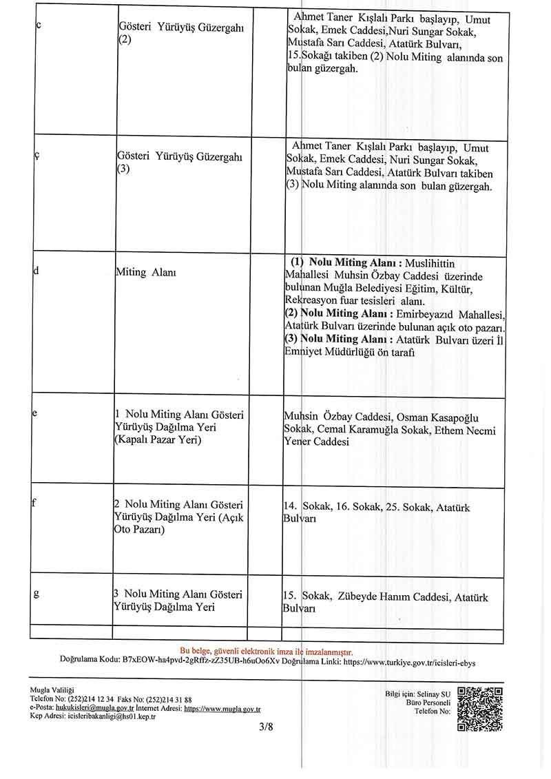 Muğla Valiliği Hukuk İşleri Müdürü Cengiz Demirci ve ekibince hazırlanan, Muğla Vali Yardımcısı Murat Sarı tarafından onaya sunulan ve Muğla Valisi Dr. İdris Akbıyık tarafından onaylanan Muğla ili toplantı, gösteri, yürüyüş güzergahları, miting alanları ile ilan ve afiş asılabilecek yerlerin tam listesi aşağıda.
